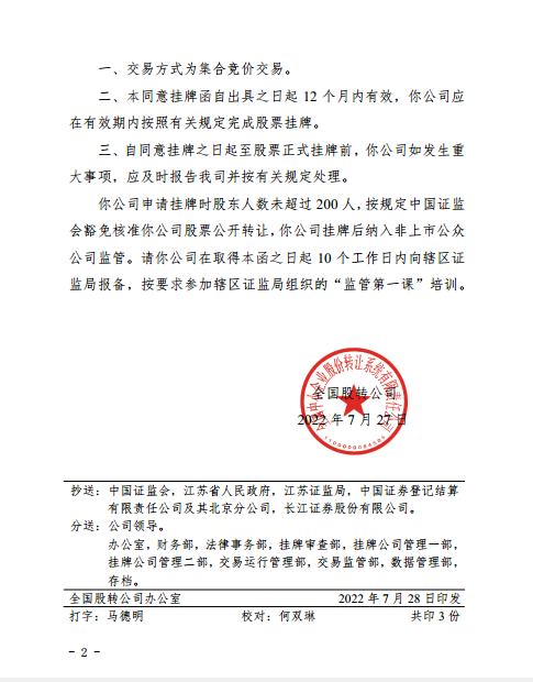 公司于2022年7月27日已取得全國(guó)股轉(zhuǎn)公司掛牌同意函,將于近期掛牌交易(代碼873805)。
